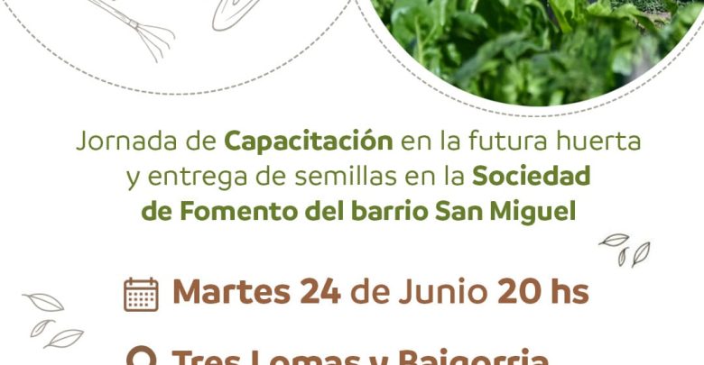 El programa "Huertas de la Ciudad" del Municipio de Bahía Blanca invita a los vecinos del barrio San Miguel a participar este martes de una jornada de capacitación y trabajo comunitario. El encuentro, que tendrá lugar a las 20 horas en la Sociedad de Fomento del barrio, ubicada en Tres Lomas y Baigorria, incluirá la entrega gratuita de semillas para fomentar la agricultura urbana.