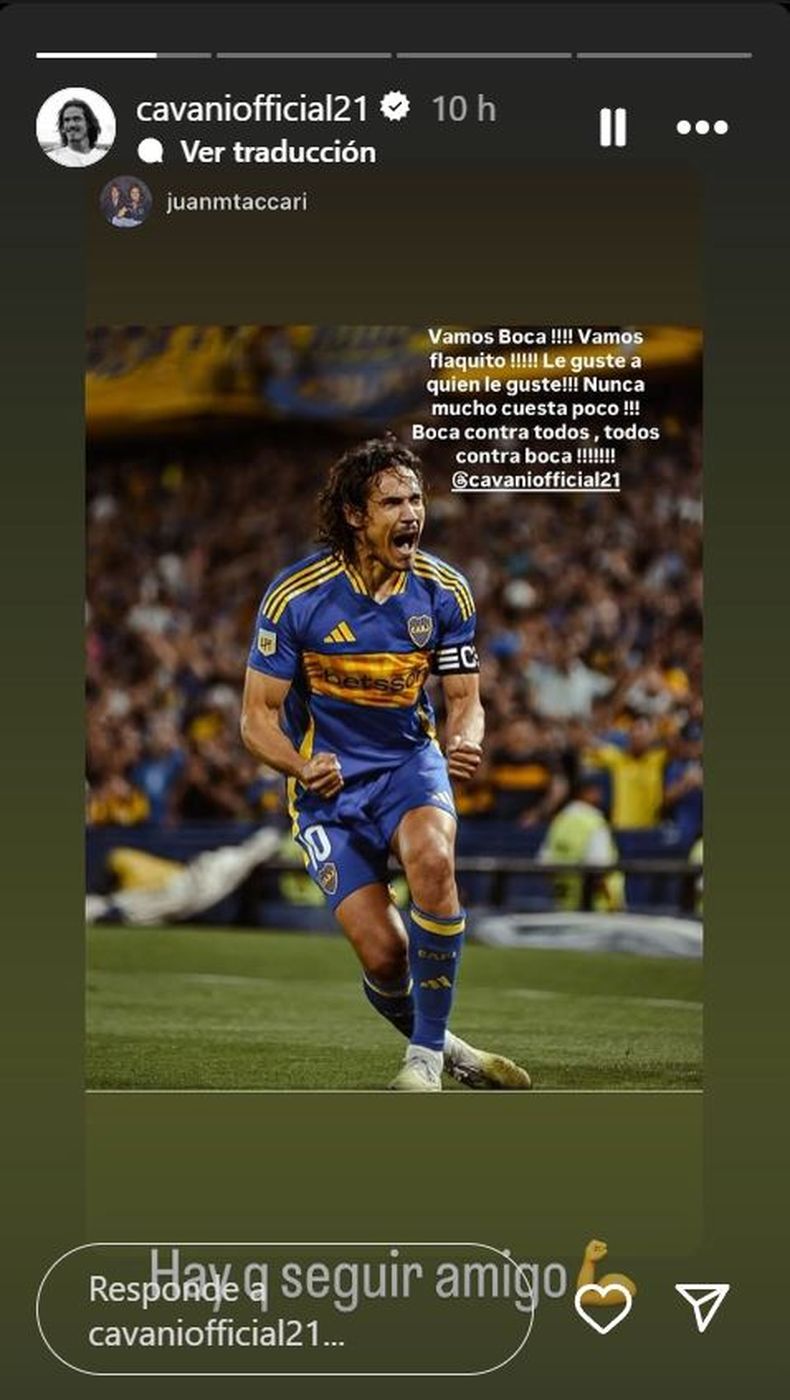 El delantero uruguayo Edinson Cavani realizó un posteo en sus redes sociales luego de la categórica victoria de Boca por 4-1 ante Godoy Cruz en La Bombonera. Replicó una imagen en su cuenta de Instagram donde puede vérselo realizando un efusivo festejo y aprovechó para dejarle un mensaje a los hinchas.“¡Vamos, Boca! ¡Vamos, Flaquito! Le guste a quien le guste. Nunca mucho cuesta poco. ¡Boca contra todos, todos contra Boca!”, señala el posteo original realizado por @juanmtaccari y compartido por el propio Cavani en sus historias junto a la frase “Hay que seguir, amigo”. Edinson Cavani fue el encargado de convertir el segundo gol para Boca en el duelo ante los mendocino tras una gran jugada colectiva de los dirigidos por Fernando Gago, que logró la primera victoria en el Xeneize.