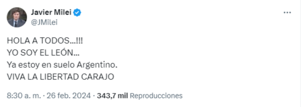 «HOLA A TODOS…!!! YO SOY EL LEÓN… Ya estoy en suelo Argentino. VIVA LA LIBERTAD CARAJO» (sic), tuiteó Milei apenas aterrizado en suelo argentino.