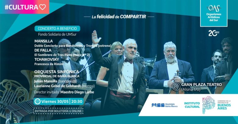 El viernes 30 de mayo a las 20:30 en el escenario del Teatro Gran Plaza la sinfónica volverá con un repertorio excepcional. El programa estará compuesto por el estreno “Doble Concierto para Bandoneón y Trompa” del bahiense Julián Mansilla, “El Sombrero de Tres Picos”, Suite Nro. 2 de Manuel de Falla y “Francesca da Rimini”, Op. 32 de Piotr Ilich Tchaikovsky.
