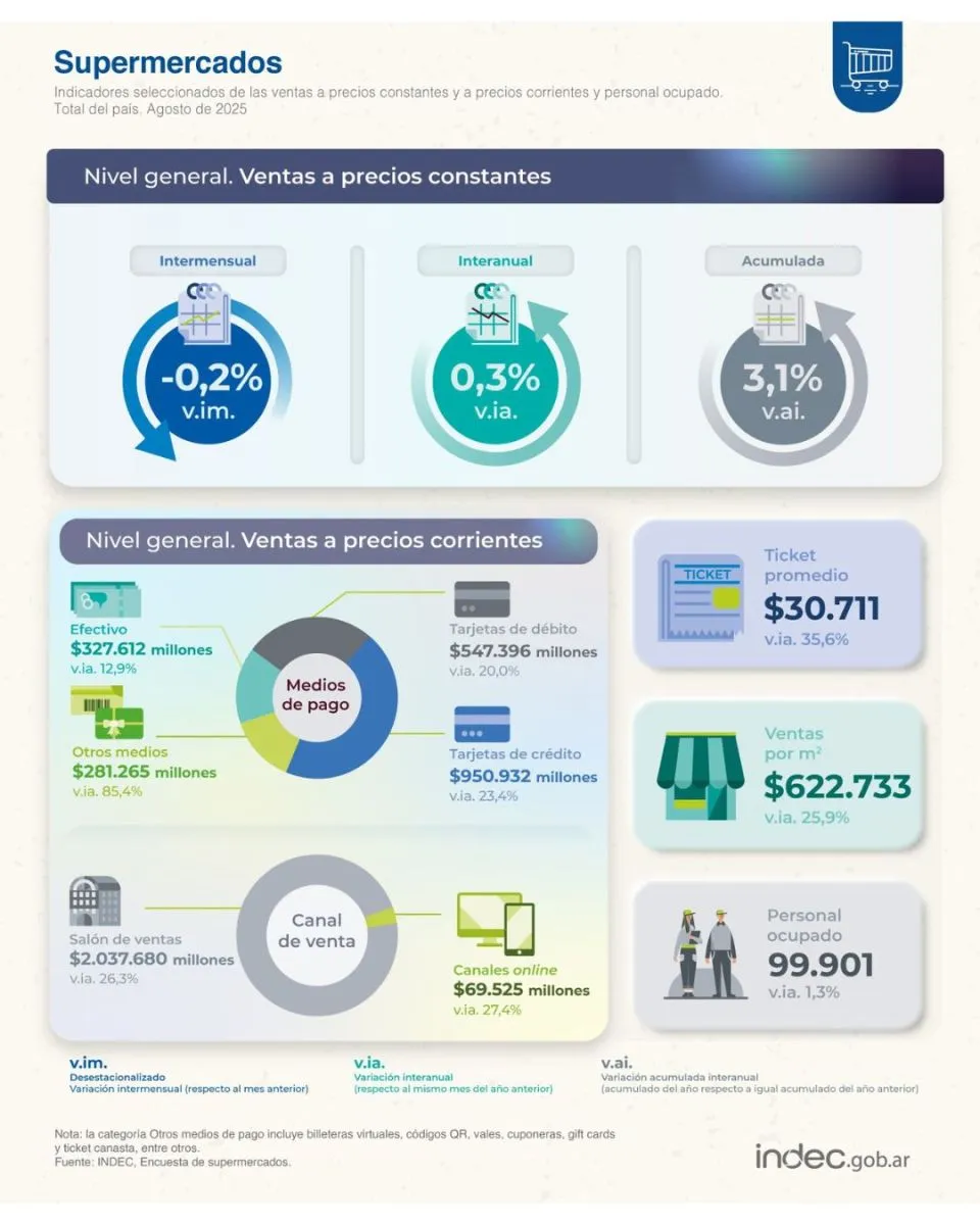 Las ventas en supermercados en Argentina registraron un aumento interanual del 0,3% durante agosto de 2025, según informó el INDEC. A pesar de la leve caída mensual del 0,2% respecto a julio, el acumulado del período enero-agosto muestra un crecimiento del 3,1% frente al mismo lapso de 2024, consolidando ocho meses consecutivos de incrementos en las operaciones minoristas. Este repunte refleja la recuperación gradual del consumo, aunque los aumentos recientes son moderados en comparación con los picos del primer trimestre del año.