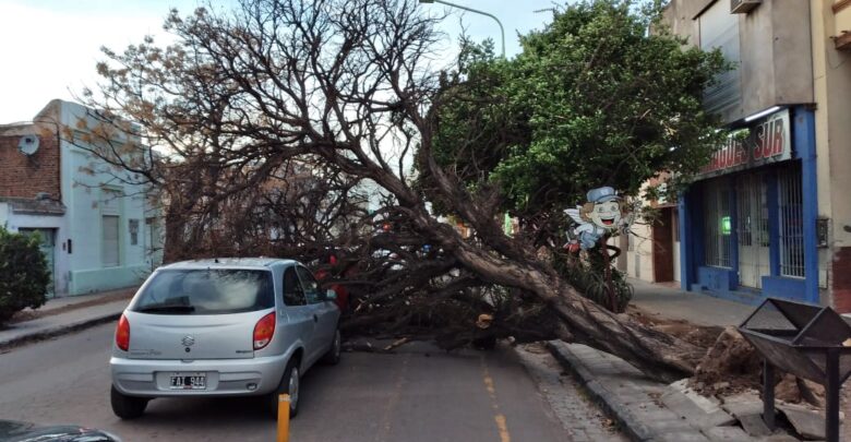 Por efecto de las fuertes ráfagas de viento, un árbol quedó apoyado sobre dos autos estacionados en la zona céntrica, sin ocasionar heridos.